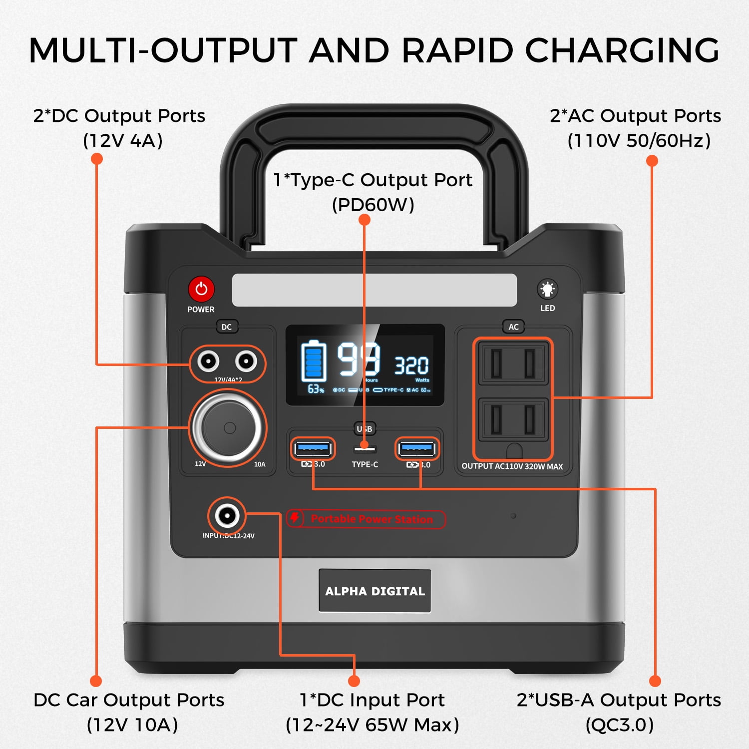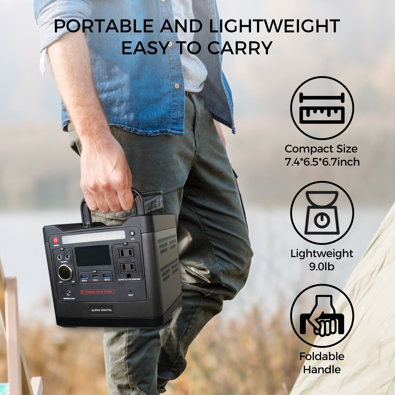 Introducing Alpha Digital’s CN320, a portable high-capacity Power Station. Recharge it effortlessly through solar, wall, or car charging. With 298Wh/93120mAh capacity and 320W power, it fuels various devices like smartphones, laptops, coolers, and more. Its foldable handle and lightweight design ensure easy transport for camping, road-trips, or home backup. Enjoy safe and efficient charging with its high power and efficiency.