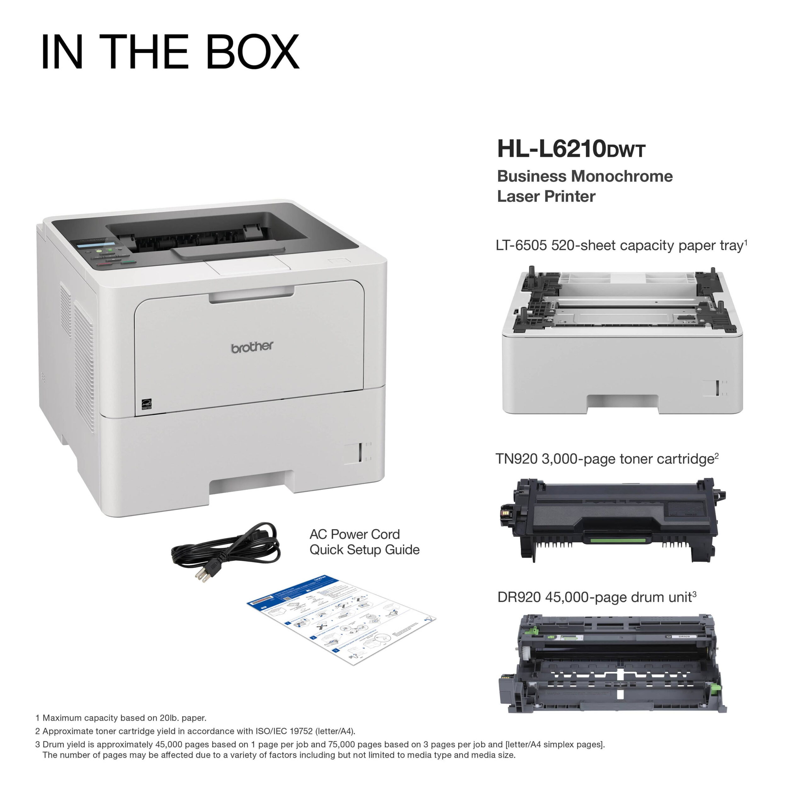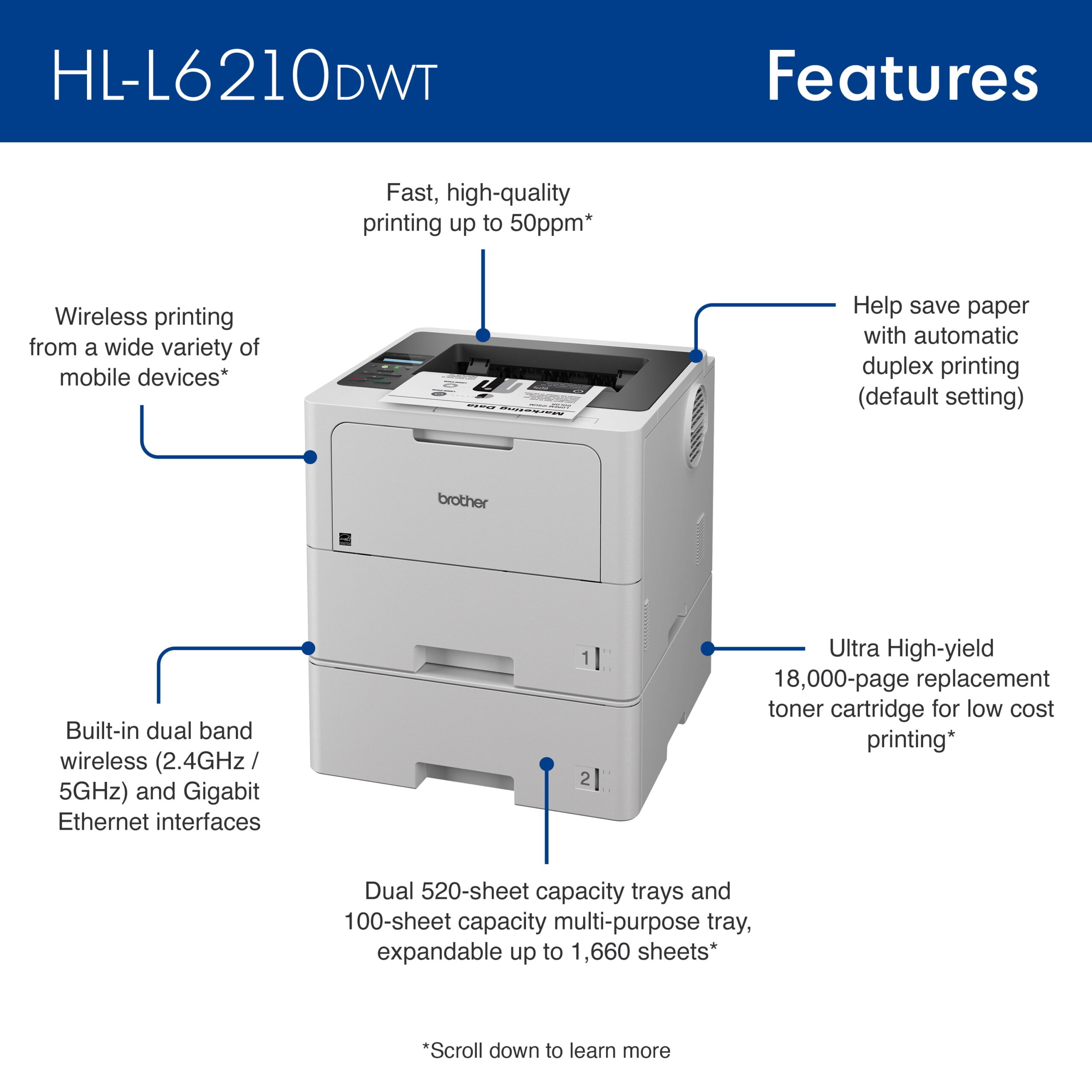 The Brother HL-L6210DWT business monochrome laser printer is a great choice for busy offices and workgroups with higher print volumes that need fast, high-quality output, low-cost printing, large paper capacity, and advanced security features. This high-performance printer helps to increase productivity with a fast print speed of up to 50ppm1. Reduce paper refills with dual 520-sheet capacity paper trays. Offers a large, expandable paper capacity that is scalable as your business needs grow. Delivers low-cost printing by using the TN920UXXL Brother Genuine ultra high-yield replacement toner cartridge. Triple Layer Security features help to limit document and device access and protect against network intrusions. The HL-L6210DWT also provides flexible connectivity with built-in Gigabit Ethernet and dual band wireless networking, plus convenient mobile device printing to meet mobile workforce demands2.