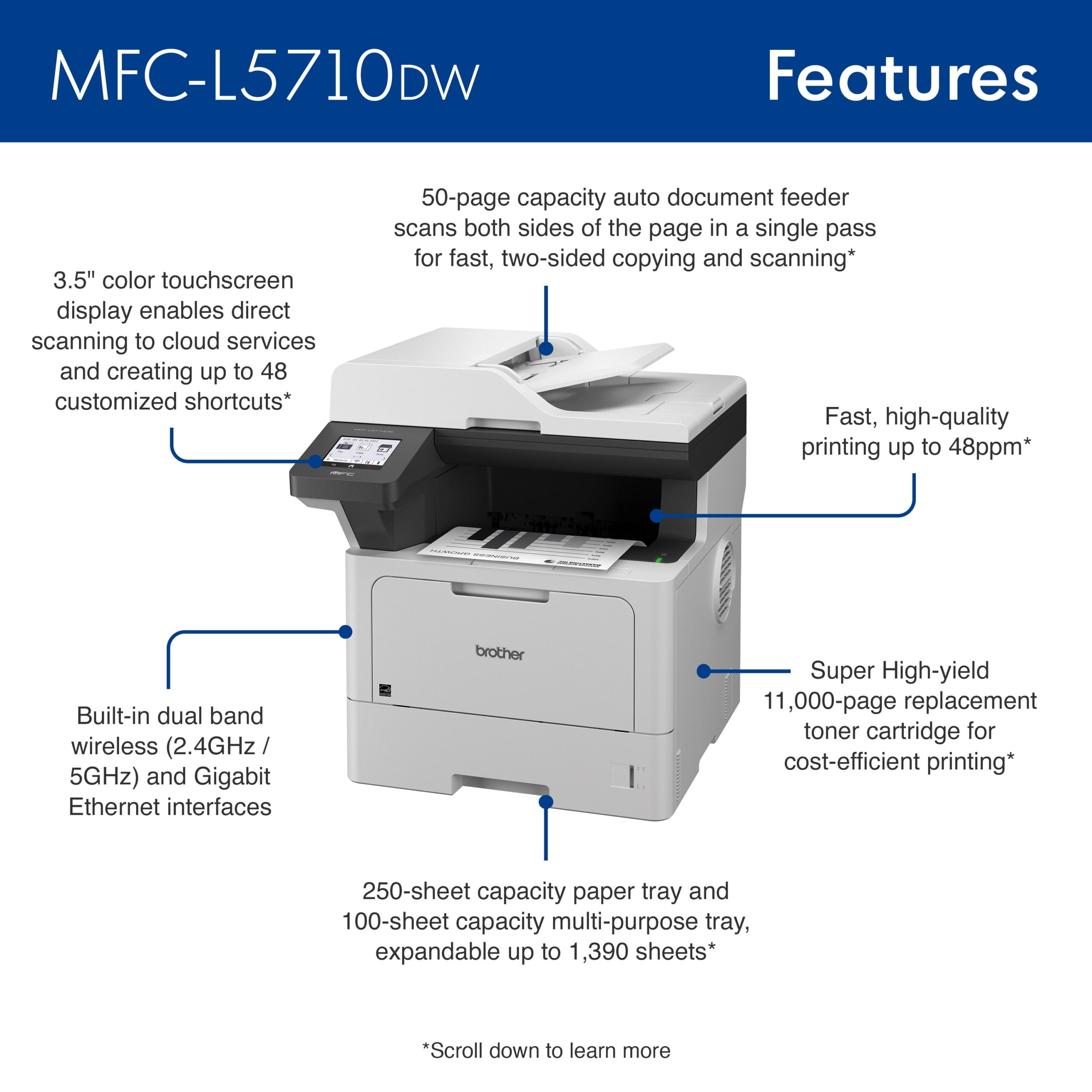 The Brother MFC-L5710DW business monochrome laser all-in-one printer is a great choice for busy offices and small workgroups that need cost-efficient printing, versatile paper handling, advanced security features, and reliable, high-quality output. This high-performance all-in-one printer helps to increase productivity with fast print and copy speeds up to 48ppm1. Delivers cost-efficient printing by using the Brother Genuine TN920XXL super high-yield replacement toner cartridge. Triple-layer security features help to limit document and device access and protect against network intrusions. Offers expandable paper capacity that is scalable as your business needs grow. Quickly scan multi-page documents to a wide variety of destinations using the 50-page capacity2 auto document feeder. The 3.5” touchscreen display allows for the creation of customized shortcuts to your most frequently used workflows. The MFC-L5710DW also provides flexible connectivity with built-in Gigabit Ethernet and dual-band wireless networking, plus convenient mobile device printing to meet mobile workforce demands3.