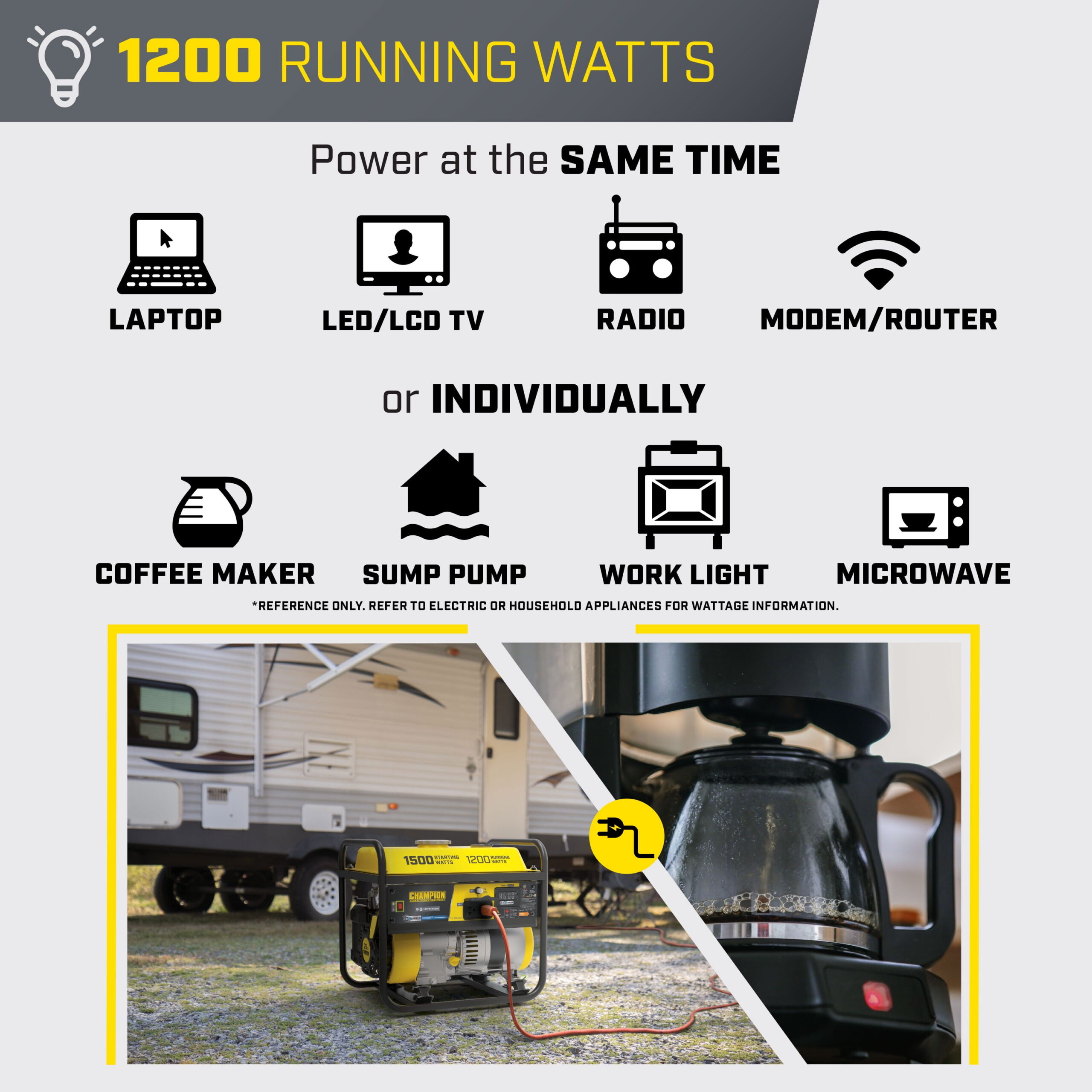 - At 1500 starting watts and 1200 running watts, enjoy up to 10 hours of run time on a full tank of gasoline with a noise level of 65 dBA from 23 feet