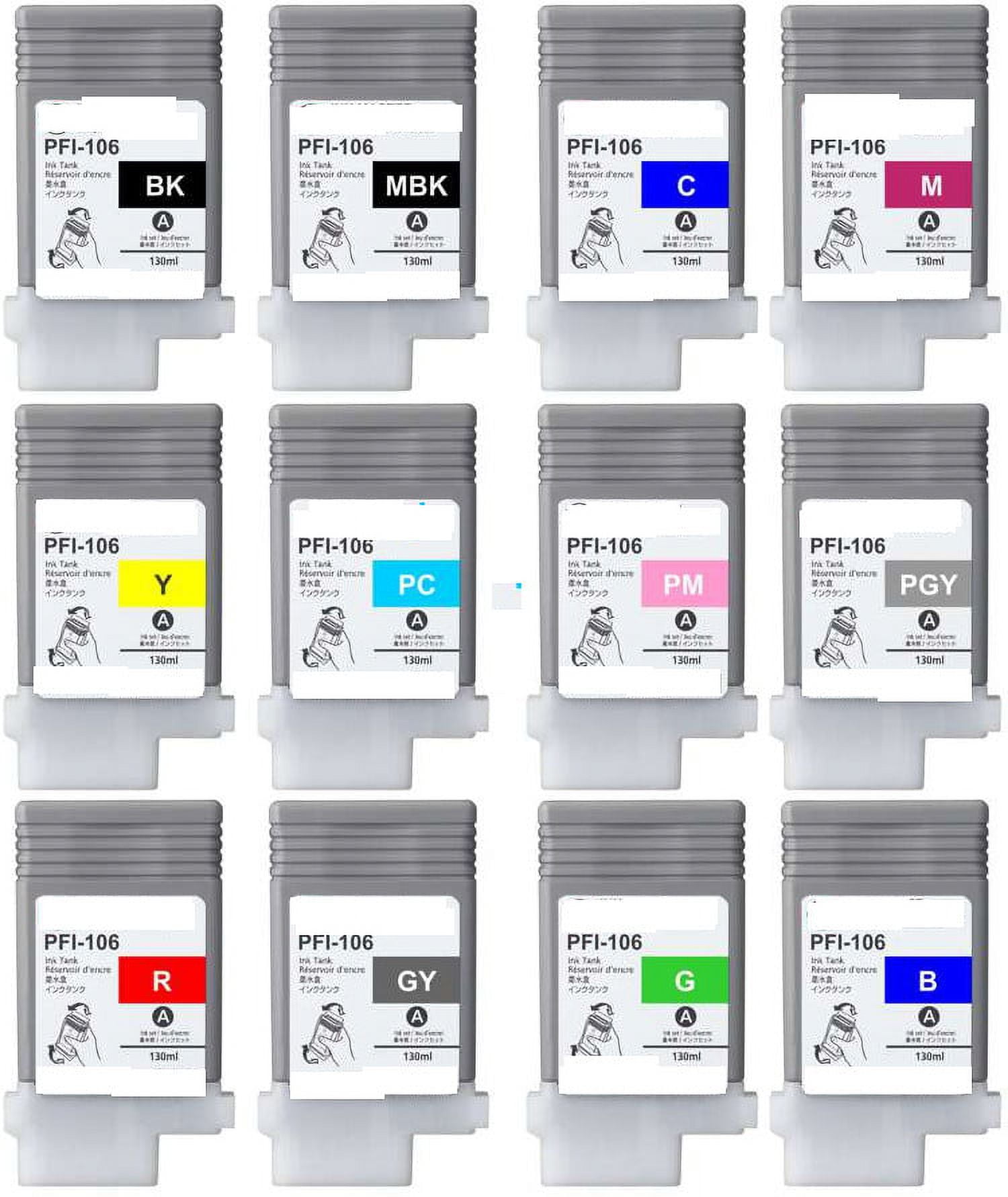 These are compatible Canon PFI-106 cartridges guaranteed to perform with Canon cartridges printers. It replaces the genuine (OEM) Canon PFI-106 cartridges. These cartridges are made with top quality components to give you the highest quality printouts every time. These compatible Canon PFI-106 cartridges are specially engineered to meet or exceed the highest standards of quality, reliability and page yields. Although these cartridge are not made or endorsed by Canon, it offers customers an economical alternative to expensive OEM Canon PFI-106 cartridges and comes with our satisfaction guarantee. 6621B001AA, 6629B001AA, 6622B001AA, 6623B001AA, 6624B001AA, 6625B001AA, 6626B001AA, 6630B001AA, 6627B001AA, 6628B001AA, 6631B001AA, 6620B001AA.