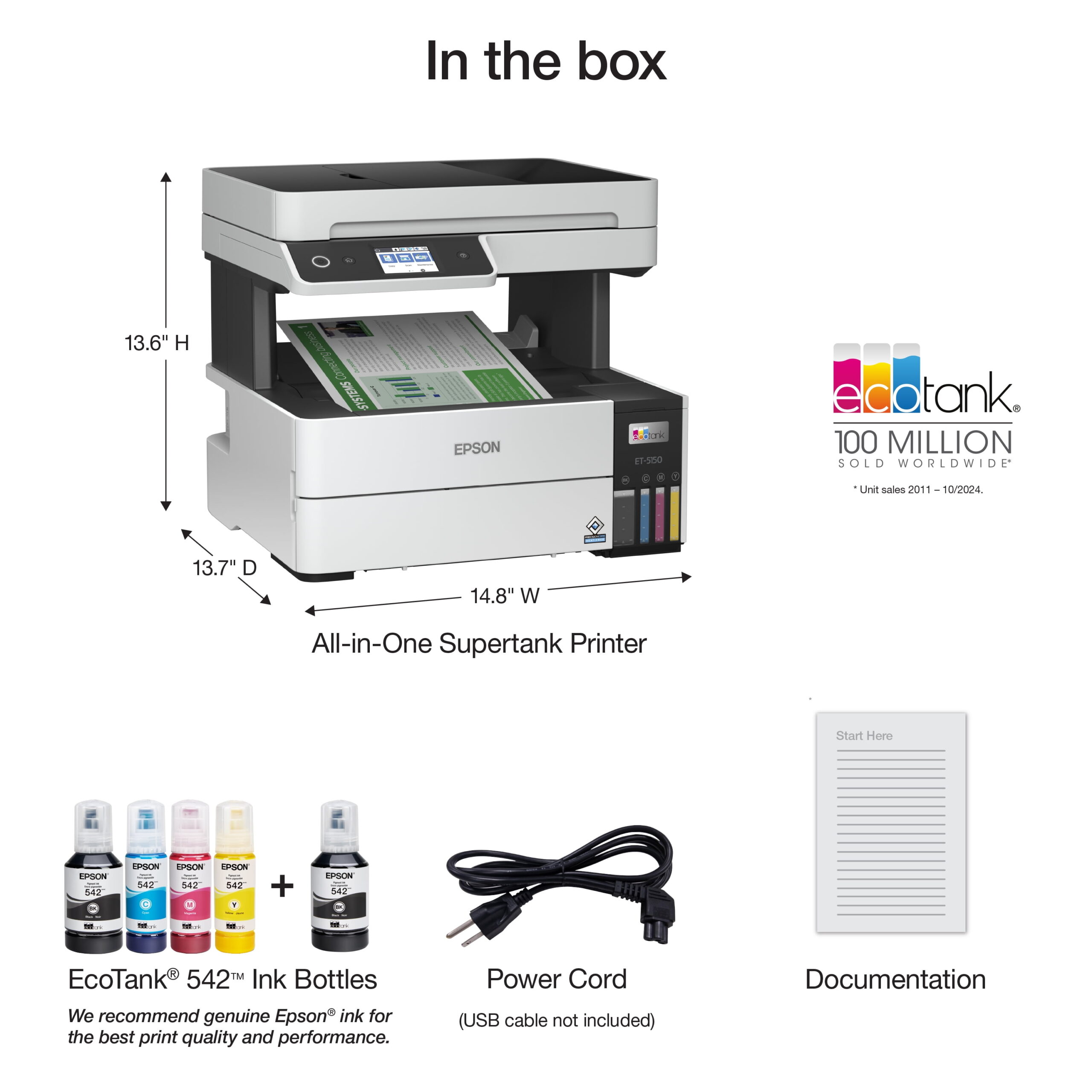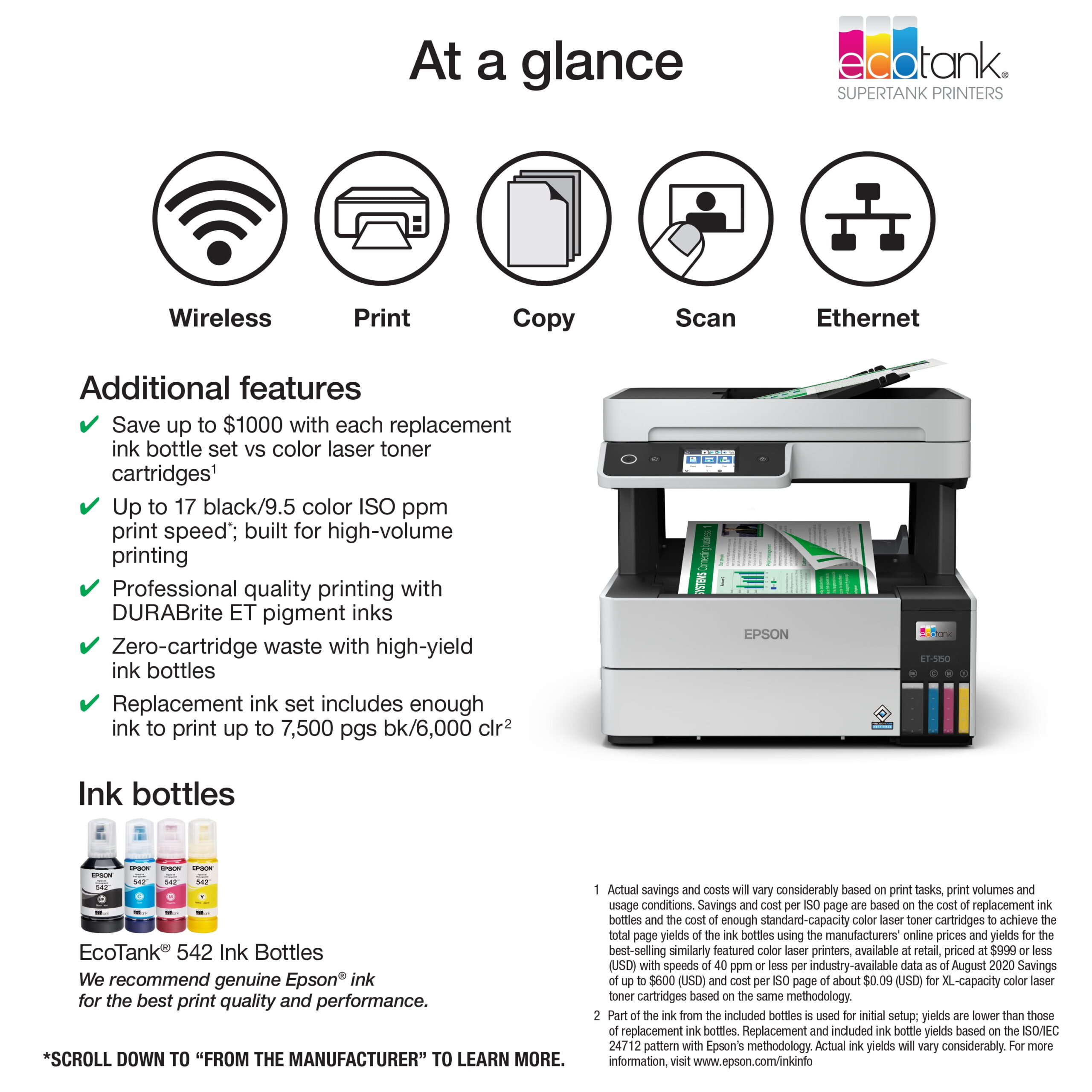 The EcoTank Pro ET-5150 all-in-one super ank printer offers fast Cartridge-Free Printing, ideal for high-volume environments. Save up to 80 percent with low-cost replacement ink bottles vs. standard-capacity color laser toner cartridge that’s about 2 cents per color ISO page versus 14 cents with cartridges1. Engineered for high productivity in a small footprint, the ET-5150 delivers professional-quality prints face down for greater privacy. Epson® DURA Brite® ET pigment ink ensures vibrant prints. This hardworking printer offers demanding businesses reliability. Plus, there’s zero cartridge waste.