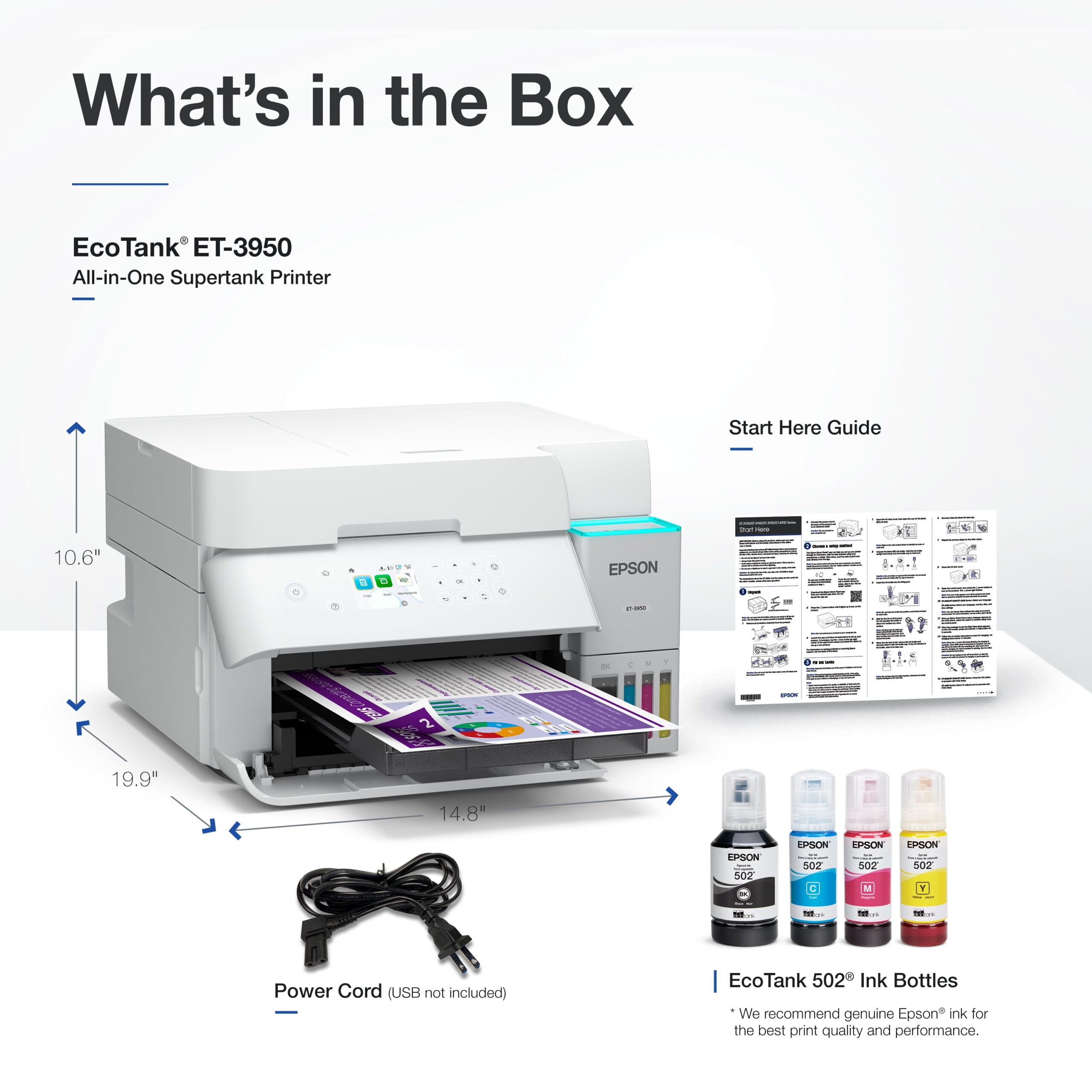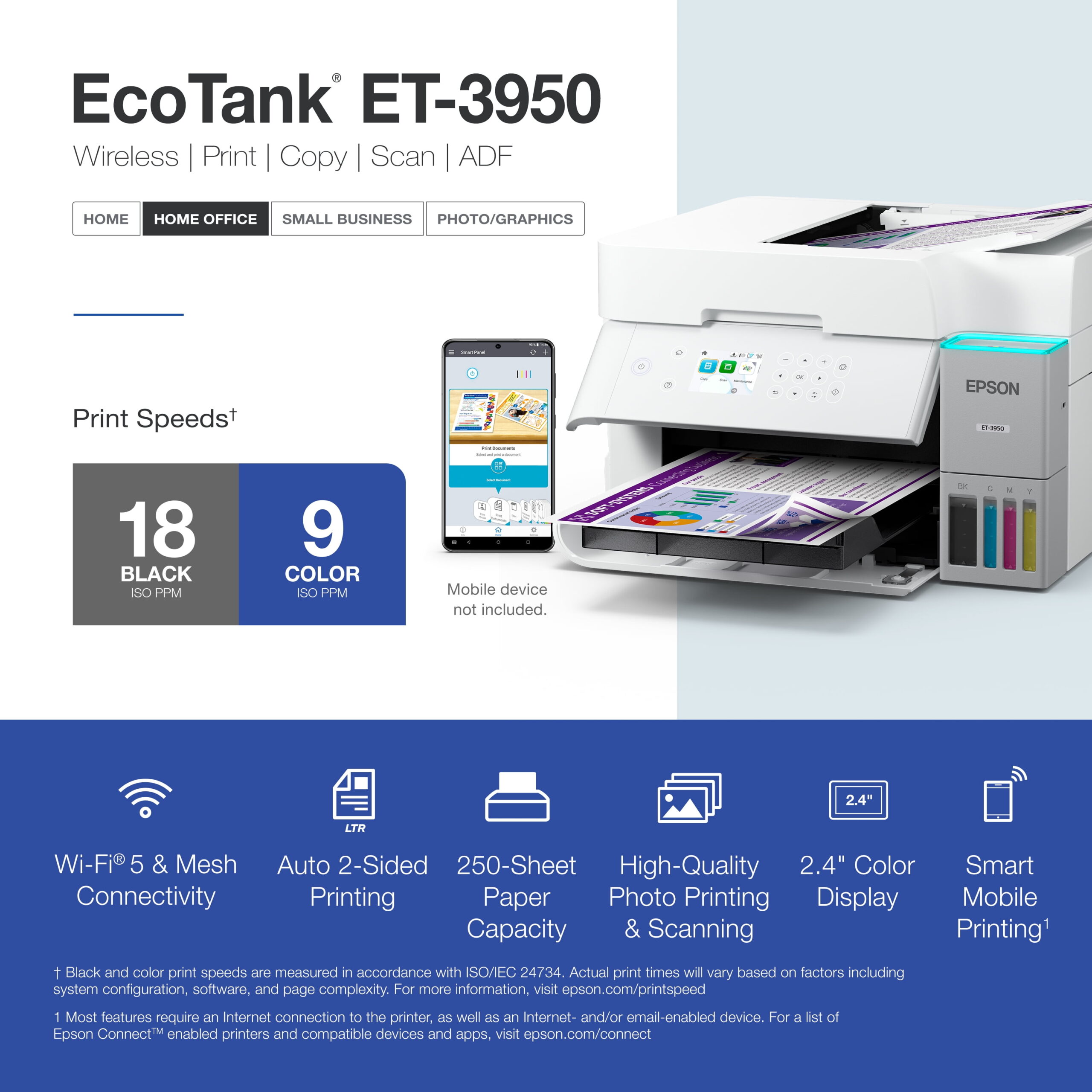 Introducing the EcoTank ET-3950 — The Perfect Printer for Busy Families. Say goodbye to expensive cartridges with the Epson EcoTank ET-3950, the newest innovation from a recognized leader in photographic printing. Combining simplicity with a modern design, the ET-3950 features advanced technology that enhances both performance and print quality, making it an ideal choice for home office printing—including content created by AI. Powered by PrecisionCore Heat-Free technology, the ET-3950 offers a duty cycle that’s twice as robust as its predecessor. And unlike conventional thermal inkjet printers, its unique permanent printhead is engineered to last the life of the printer. Designed to be simple and error-free, refilling ink is a breeze with large ink tanks and uniquely keyed EcoFit bottles—no mess, no stress and no ink bottle mix-ups. And with enough ink in the box to last up to three years, you’ll enjoy affordable color printing without the hassle of frequently replacing cartridges. Featuring Ethernet and Wi-Fi for seamless connectivity, along with the user-friendly Epson Smart Panel app, you can easily print, scan, and more directly from your computer or mobile device. Choose Epson EcoTank, the #1 Best-Selling Supertank Printer. With more than 100 million units sold globally across seven generations of innovation, EcoTank consistently delivers affordable, photo-quality prints, making it a reliable choice for all your printing needs.