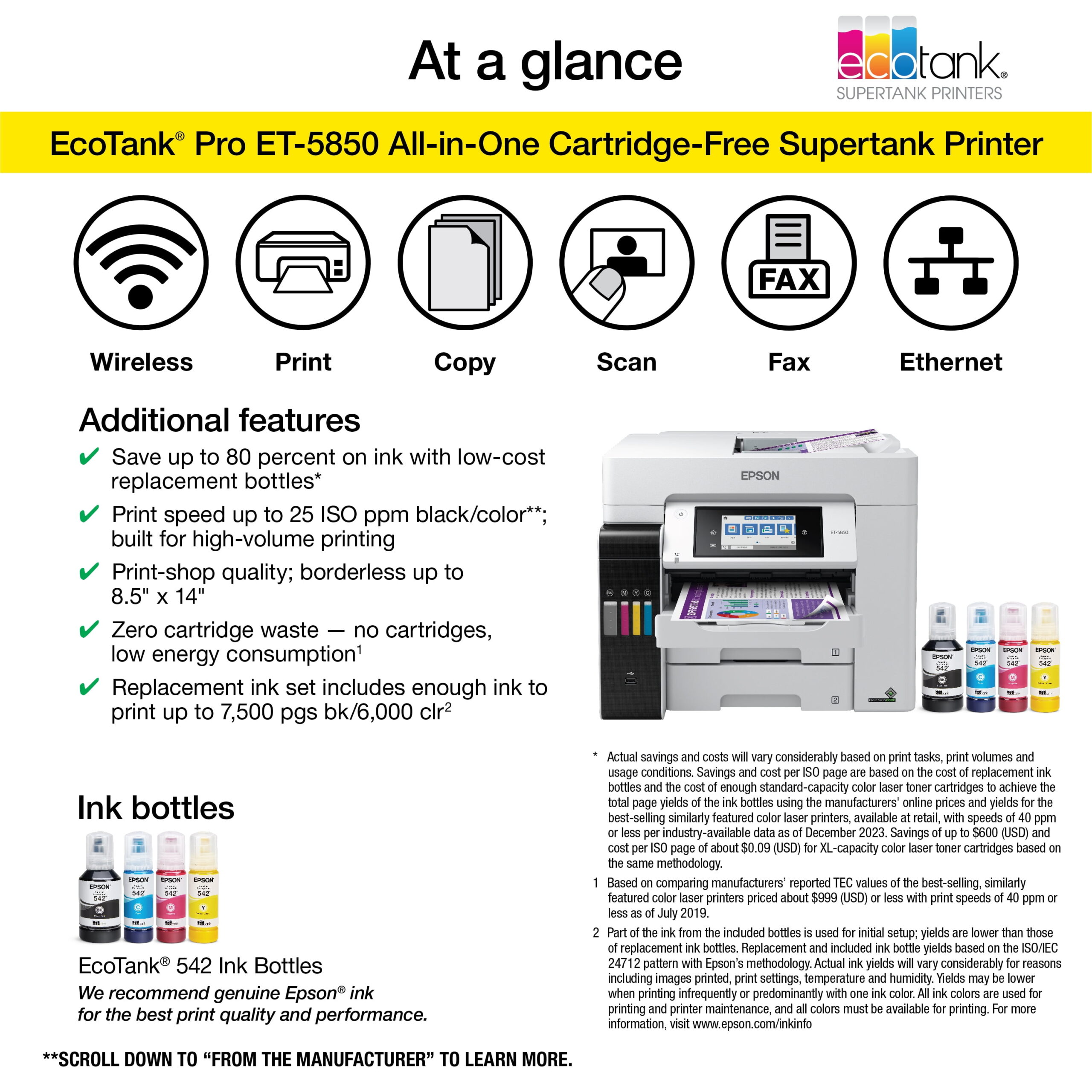 The EcoTank Pro ET-5850 wireless all-in-one offers fast Cartridge-Free Printing with easy-to-fill supersized ink tanks. You can save up to 80 percent with low-cost replacement ink bottles vs. standard-capacity color laser toner cartridges1 – about 2 cents per color ISO page versus 14 cents with cartridges1. PrecisionCore® Heat-Free Technology delivers high-volume, print-shop-quality output, plus speeds up to 25 ISO ppm black and colorÆš. This all-in-one with Epson® DURABrite® pigment-based ink delivers vibrant borderless prints up to 8.5″ x 14″. Each replacement ink set includes enough ink to print up to 6,000 pages2. Plus, there’s zero cartridge waste and very low energy consumption3. The ET-5850 features a 500-sheet front tray paper capacity and rear specialty-paper feed, plus a 4.3″ color touchscreen and hands-free voice-activated printing4.
