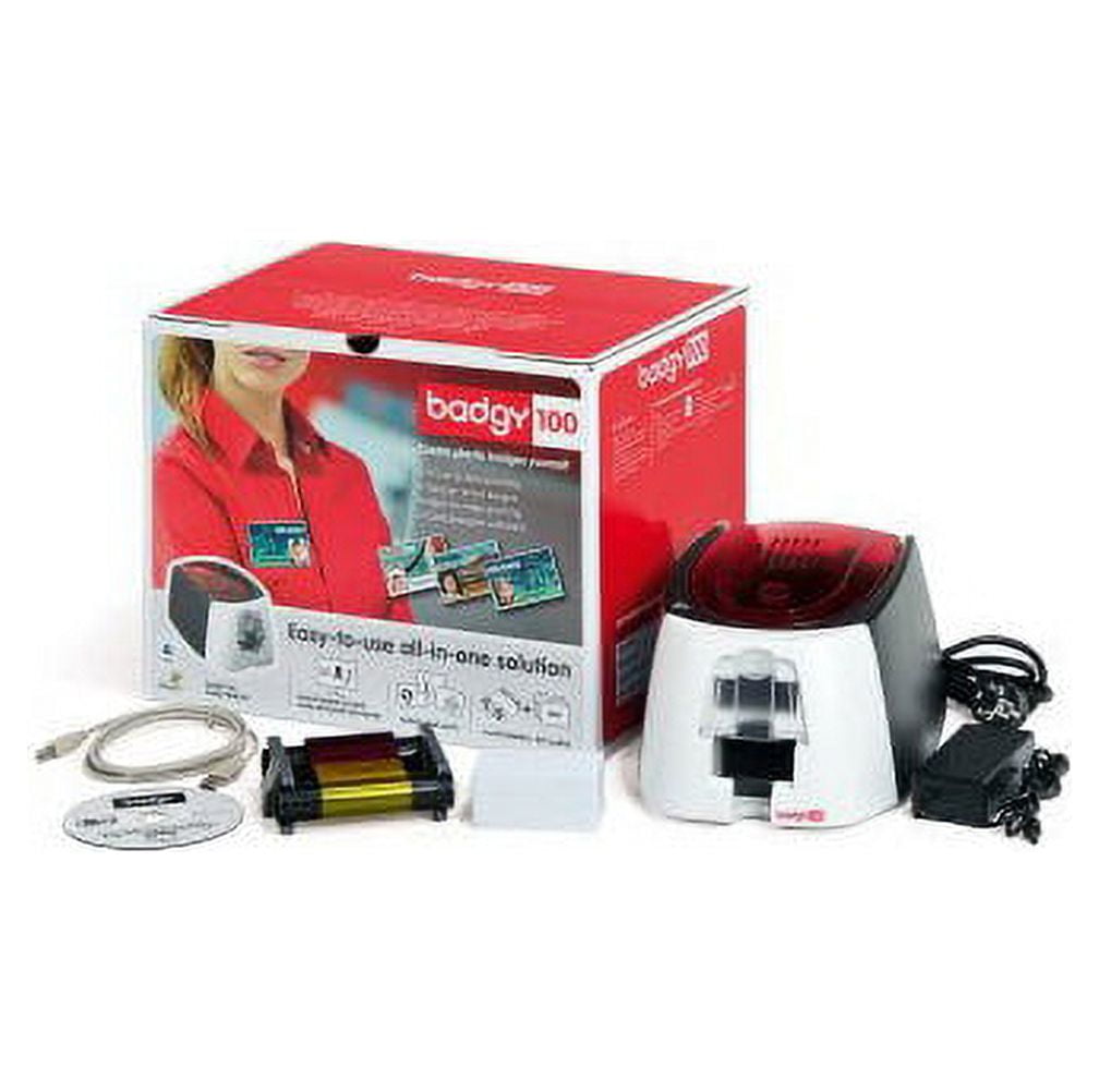 Badgy100 is a desktop solution to print custom plastic badges on demand and lets you easily import your databases. Print tamperproof badges for students, employees, members, gift cards and more. Set comes complete with printer, color ribbon with 50-print capacity, 50 thick PVC cards, ID design software, and USB 2.0 and power cables. Print plastic badges with small border (1.35mm) at a speed of 45 seconds for color cards and 16 seconds per black/white cards. Printer is compatible with PC and Mac as well as USB 1.1 and 3.0.