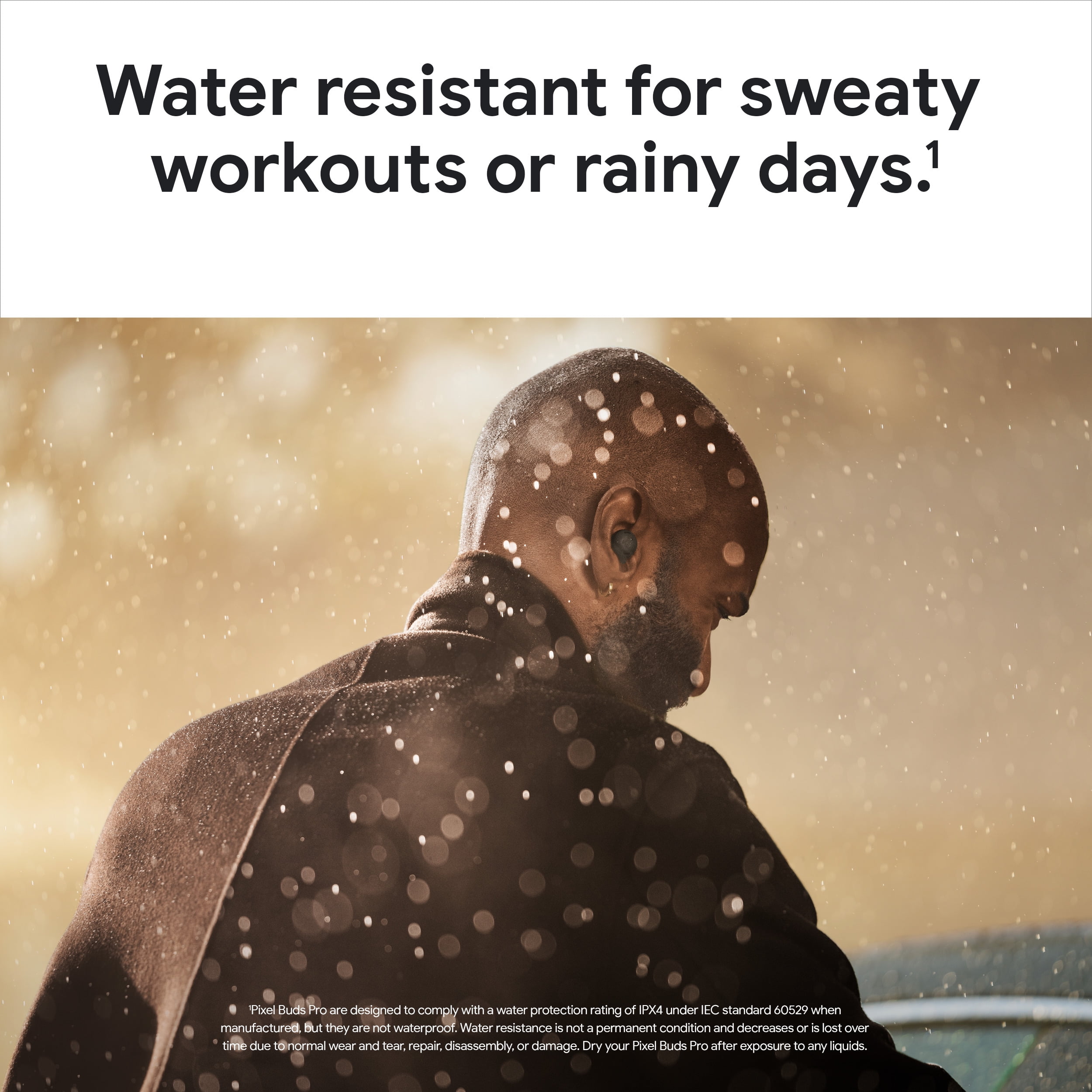• Pixel Buds Pro are designed to comply with a water protection rating of IPX4 under IEC standard 60529 when manufactured, but they are not waterproof. Water resistance is not a permanent condition and decreases or is lost over time due to normal wear and tear, repair, disassembly, or damage. Dry your Pixel Buds Pro after exposure to any liquids.