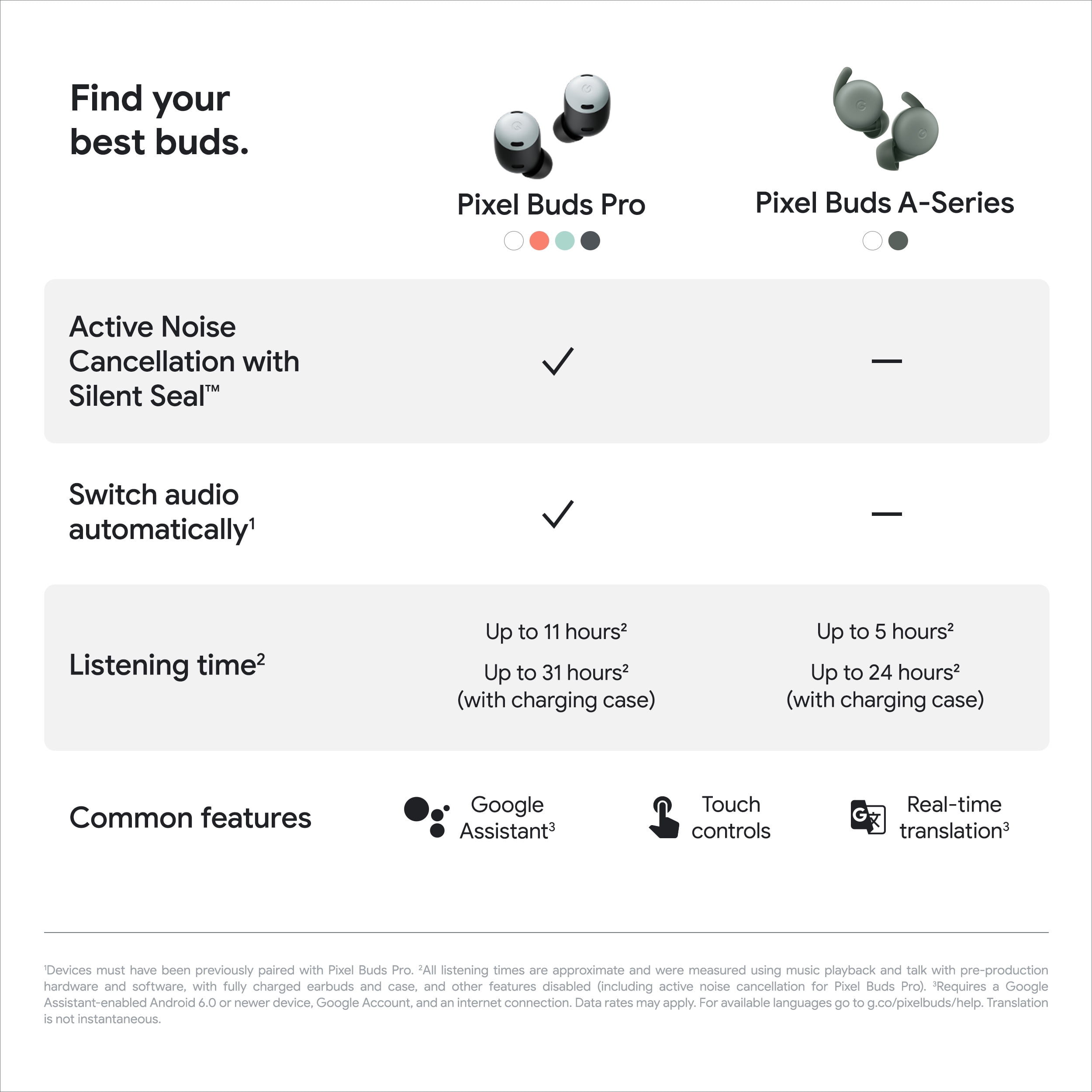Meet Google Pixel Buds Pro, with premium, immersive sound that adapts to you. Active Noise Cancellation with Silent Seal™ blocks outside sounds so music shines, while Volume EQ automatically adjusts the tuning to sound balanced at every level.1 Ask Google for hands-free help on the go.2 And get up to 11 hours of listening time – and up to 31 with the charging case.6