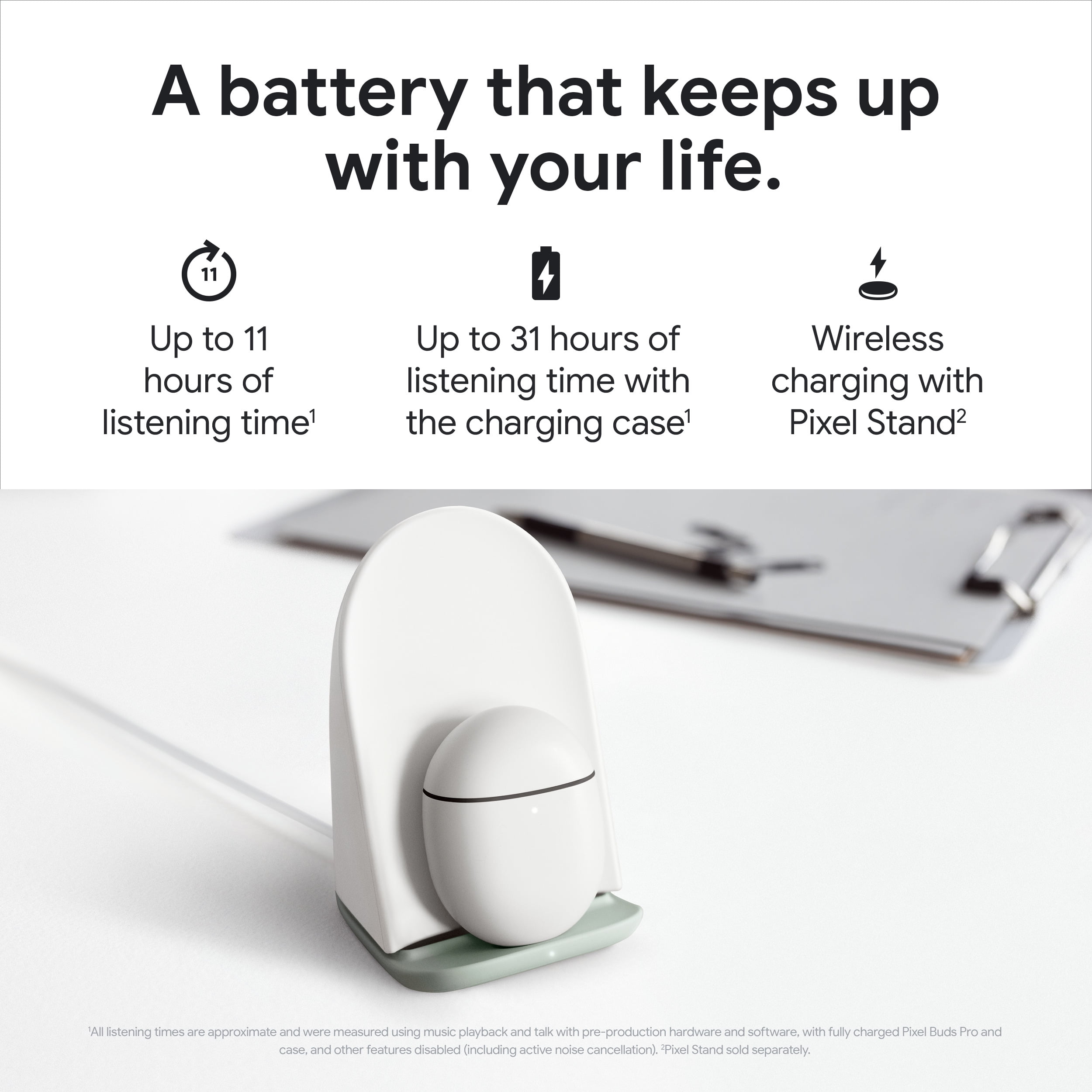 • All listening times are approximate and were measured using music playback with pre-production hardware and software, with fully charged Pixel Buds Pro and case, and other features disabled (including active noise cancellation). Case is used to recharge Pixel Buds Pro. Charging times are approximate. Use of other features will decrease battery life. Battery life depends on device, features enabled, usage, environment and many other factors. Actual battery life may be lower.