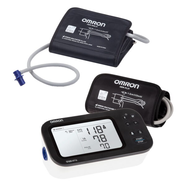 Keep track of your blood pressure with the Omron 7 Series Upper Arm Blood Pressure Monitor and 9-In. to 17-In. Wide-Range D-Cuff Kit. Screen for AFib in just 1 blood pressure measurement with the 7 Series Upper Arm Blood Pressure Monitor. This clinically validated monitor features Omron-exclusive AFib Screening Technology, an easy-to-read screen, stores up to 120 readings for 2 users (60 readings each), and seamlessly transfers results to your mobile device through the free Omron Connect app. The durable and contoured Wide Range D-ring cuff wide range cuff fits arms 9 in. to 17 in. in circumference. To determine your appropriate cuff size, use a cloth measuring tape and measure the circumference of your left upper arm, midway between your elbow and shoulder. Ensuring that the blood pressure cuff is neither too tight nor too loose will help ensure the most accurate readings, providing you a more accurate picture of your heart’s health.
