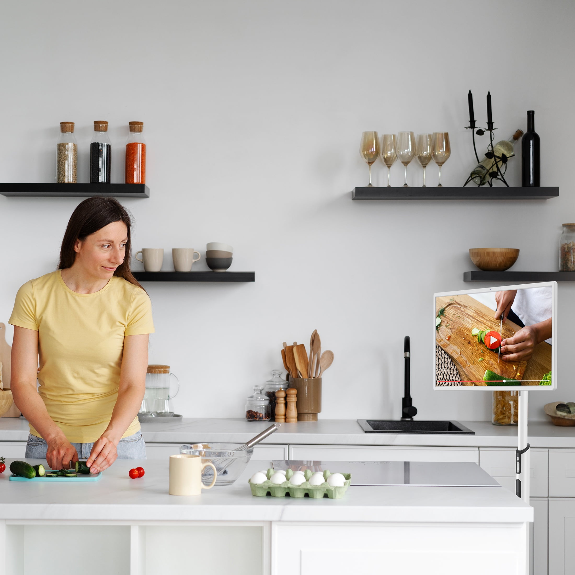 - Adjustable Viewing Angles: Articulating adjustable arm for multiple viewing angles and height adjustments. Full swivel rotation and adjustable tilt for comfortable viewing in portrait or landscape mode.