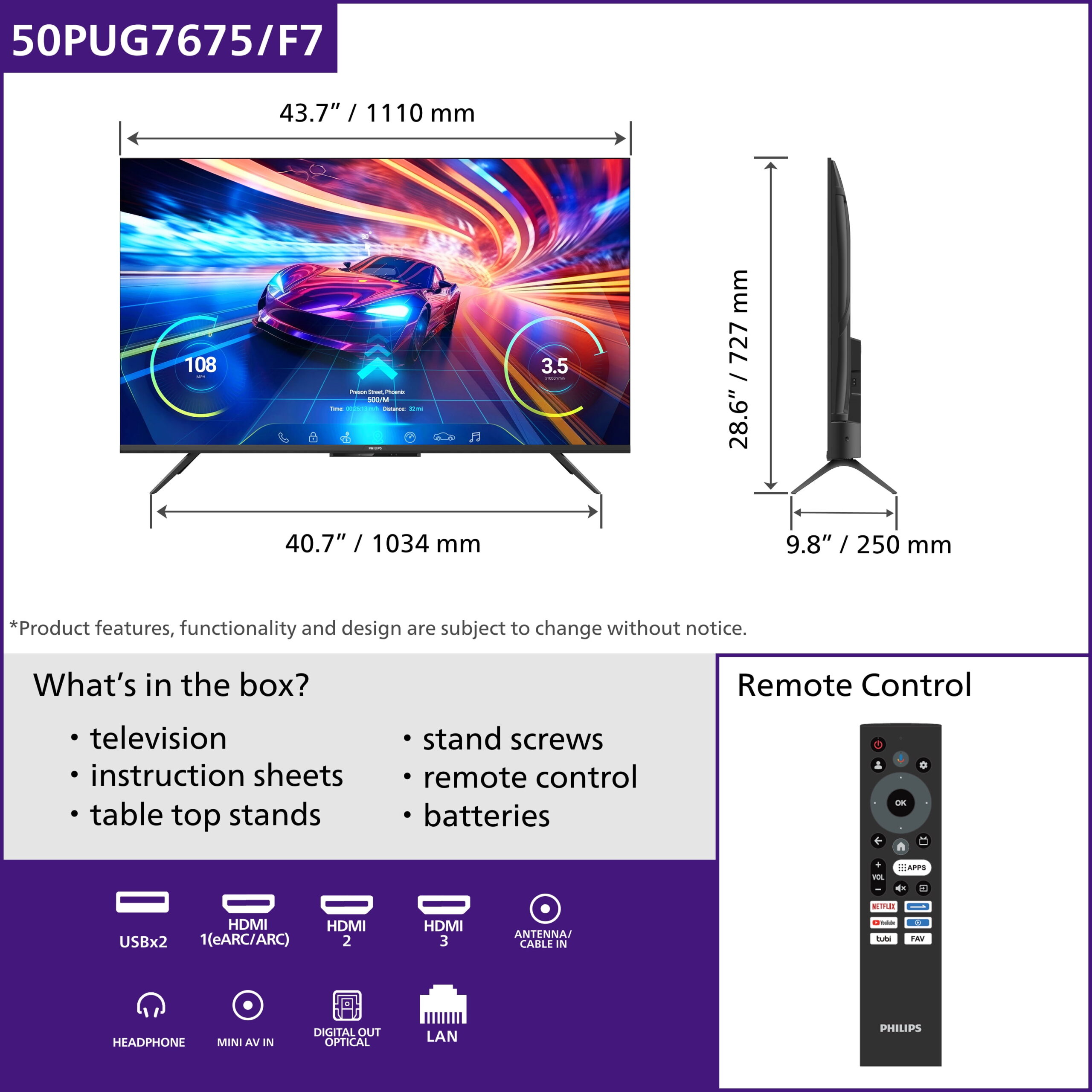 Experience the ultimate in-home entertainment with the Philips 50″ Class 144Hz QLED 4K Ultra HD (2160p) Gaming Google Smart LED TV (50PUG7675/F7). With the ability to bring together all of your favorite movies, shows, live TV, and more from across your apps, this innovative TV is designed to cater to your individual needs. Experience a wider range of color, contrast and brightness output with quantum dot technology, bringing your movies even closer to reality. Stay victorious in your favorite games with a faster response rate panel. Enjoy less smearing in gaming sessions so you don’t miss a moment of action. AMD Freesyncâ„¢ Premium paired with Game Mode allows fluid tear-free gaming in all resolutions while automatically adjusting settings for the lowest input lag, so you can enjoy 4K UHD HDR games with high detail and clarity. With the Philips Gaming Google TV, you can enjoy the best of both worlds – unparalleled convenience and exceptional performance. So why wait? Discover the entertainment you love today with the Philips Google TV.