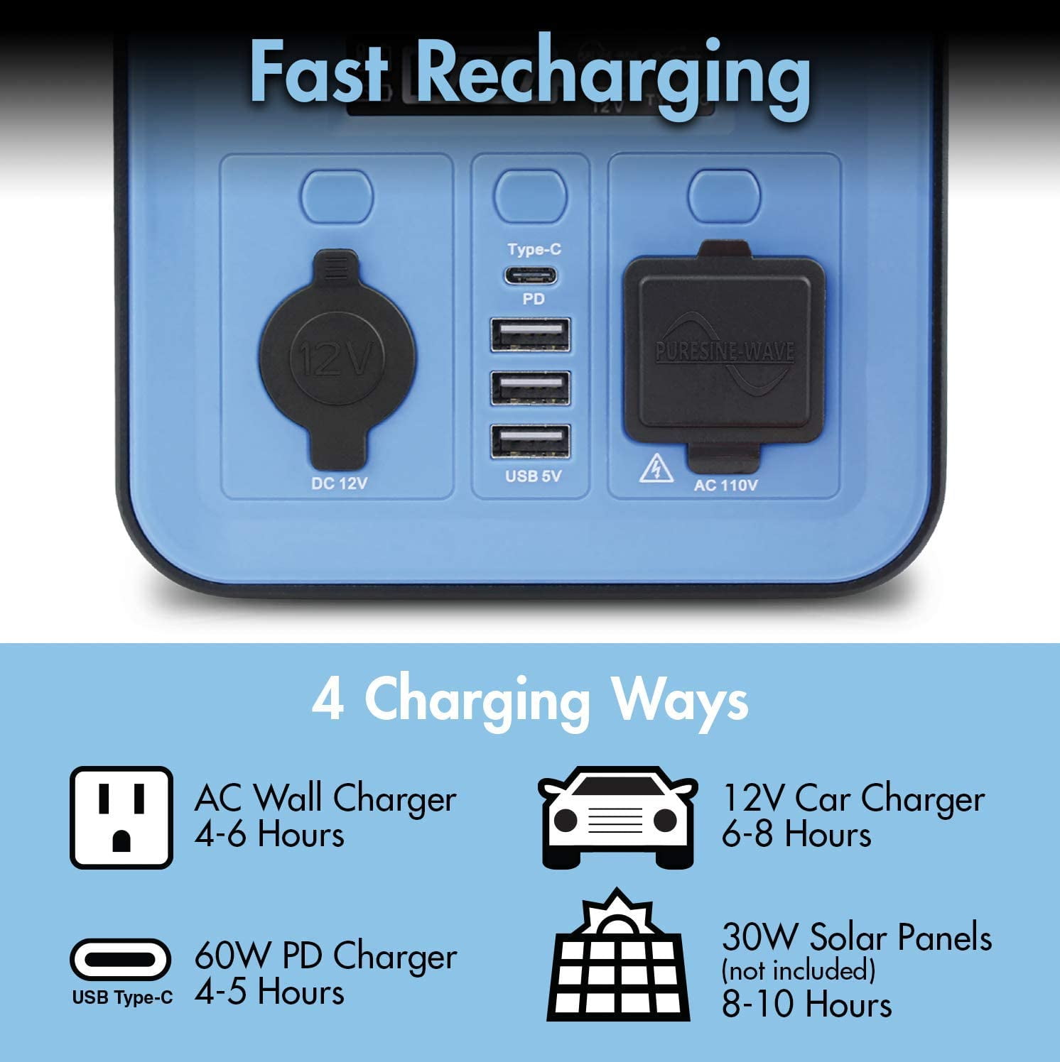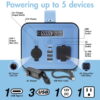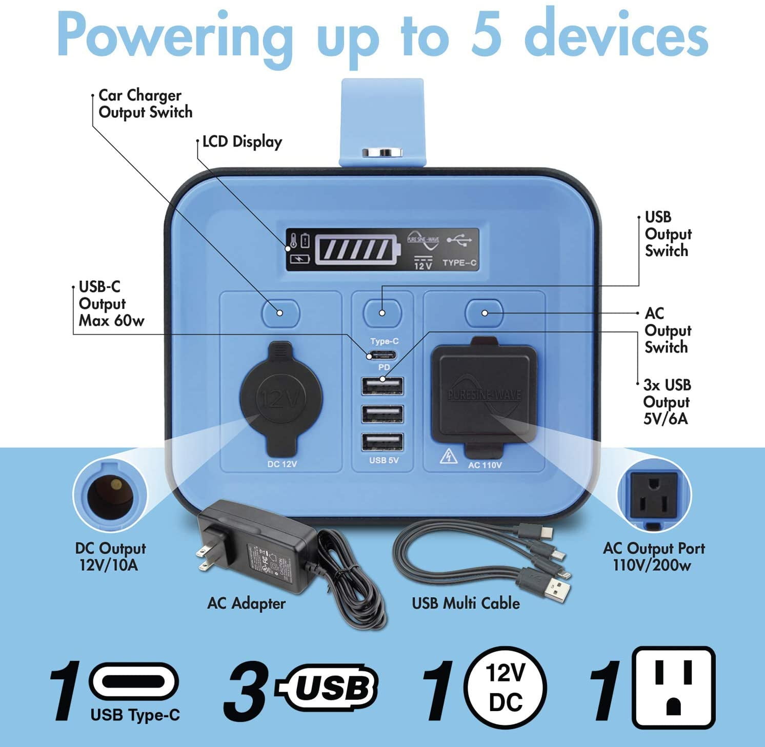 - Charge up to 5 devices with 6 output ports including 1 x AC 110V/200W pure sine wave, 3 x USB-A, 1 x Type-C, and 1 DC port