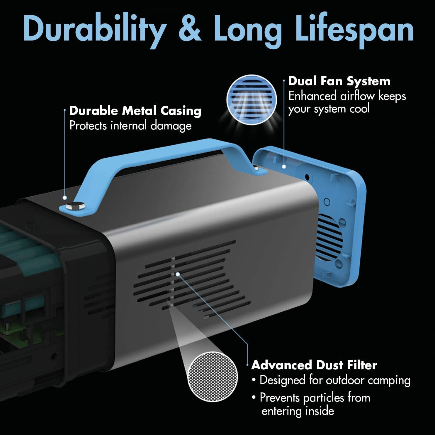 - Quiet generator with a dual fan system to enhance airflow and keep the power source cool