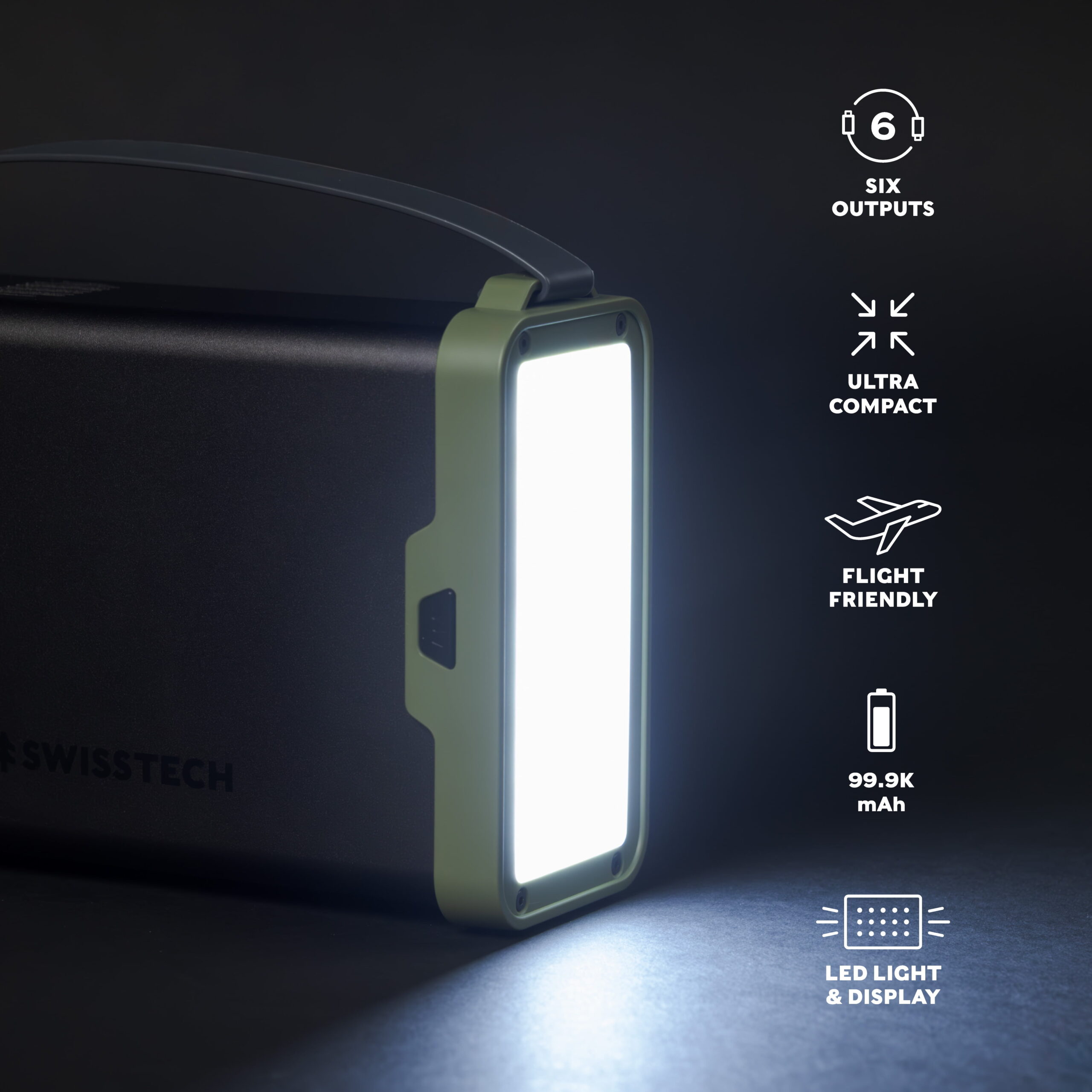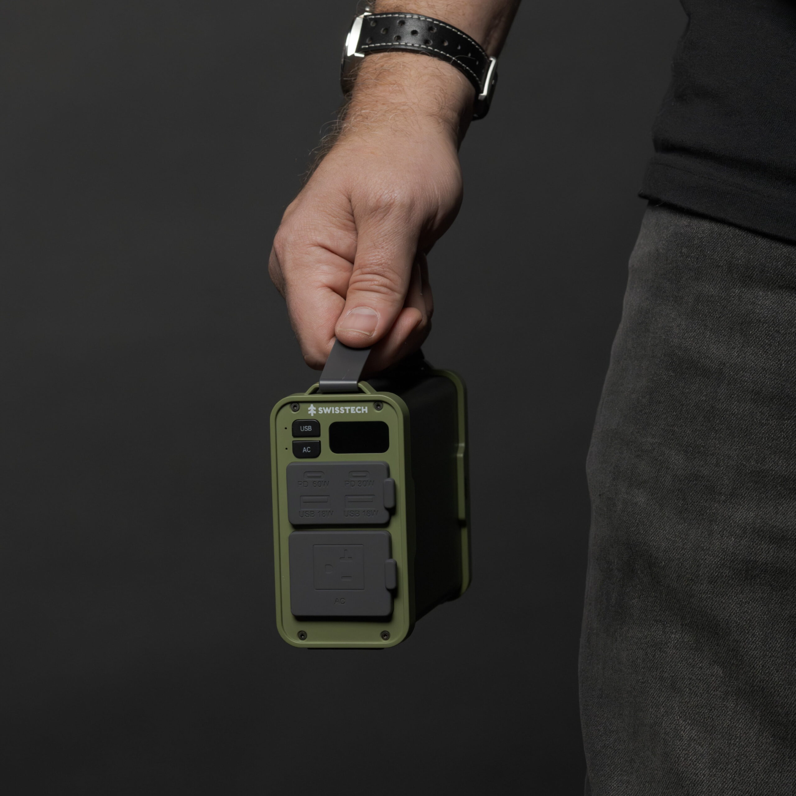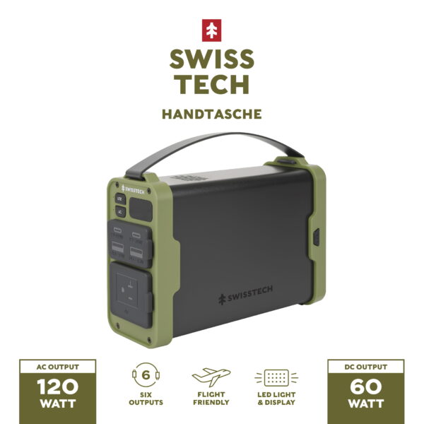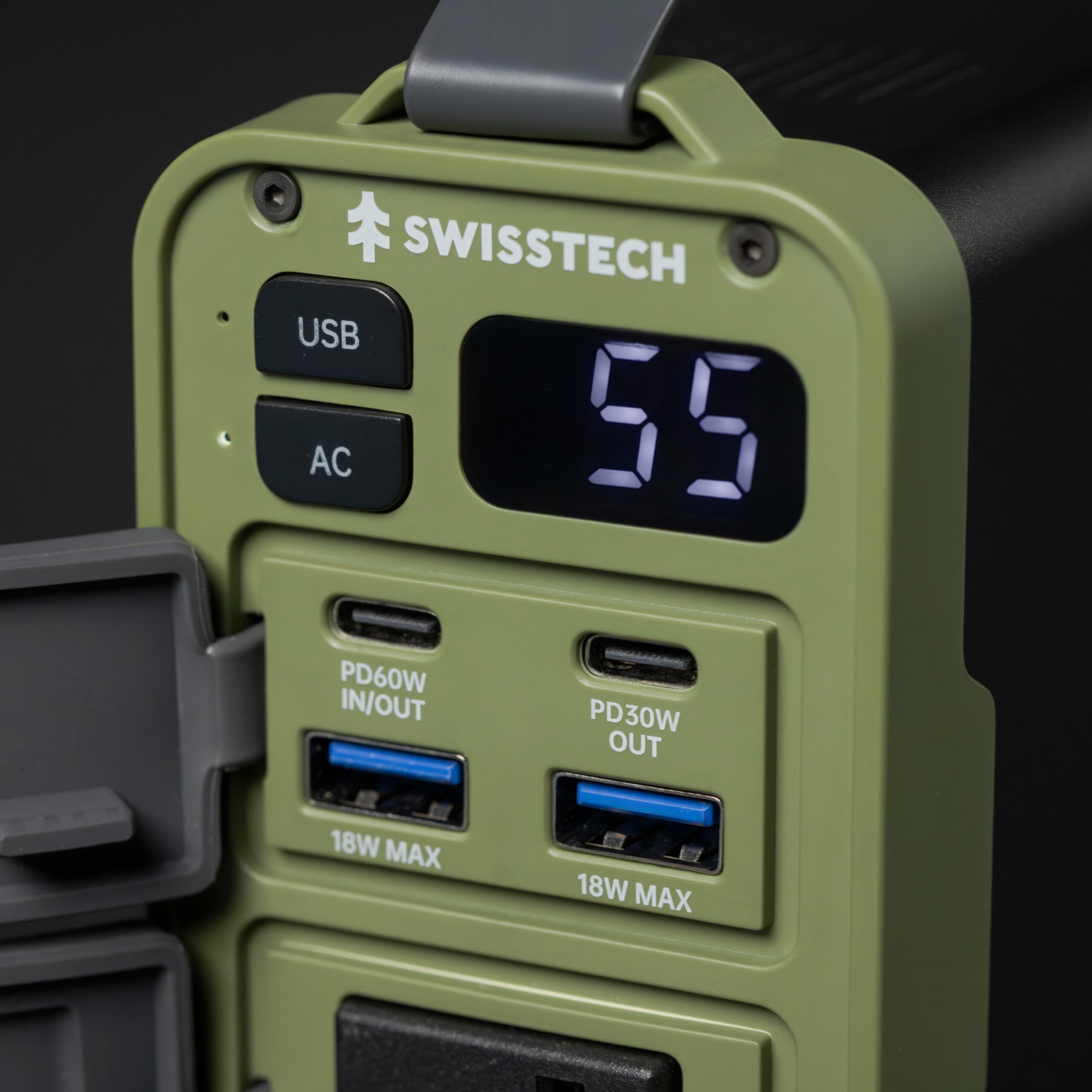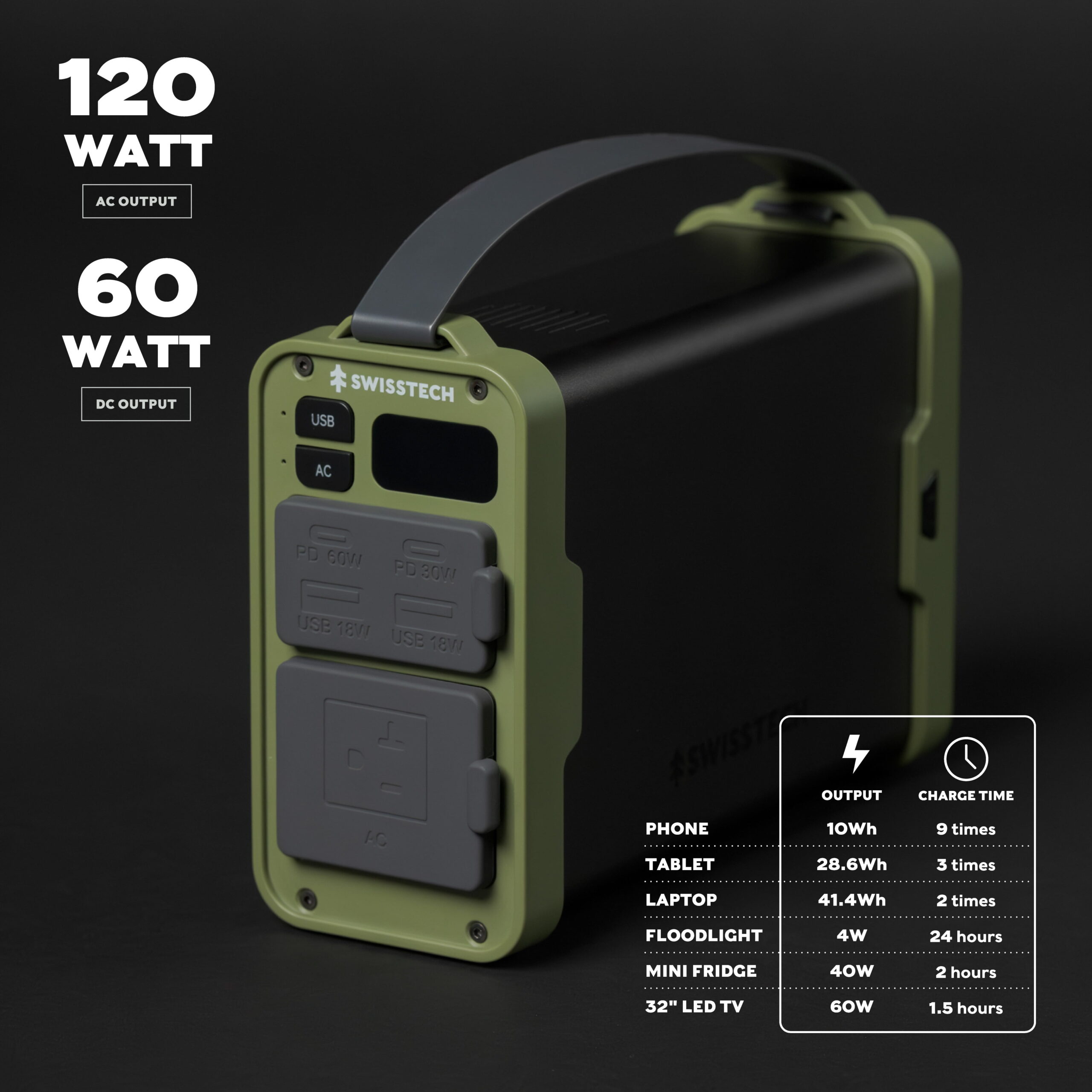- Swiss Tech brand 99.9Wh capacity portable power station for outdoor and emergency use