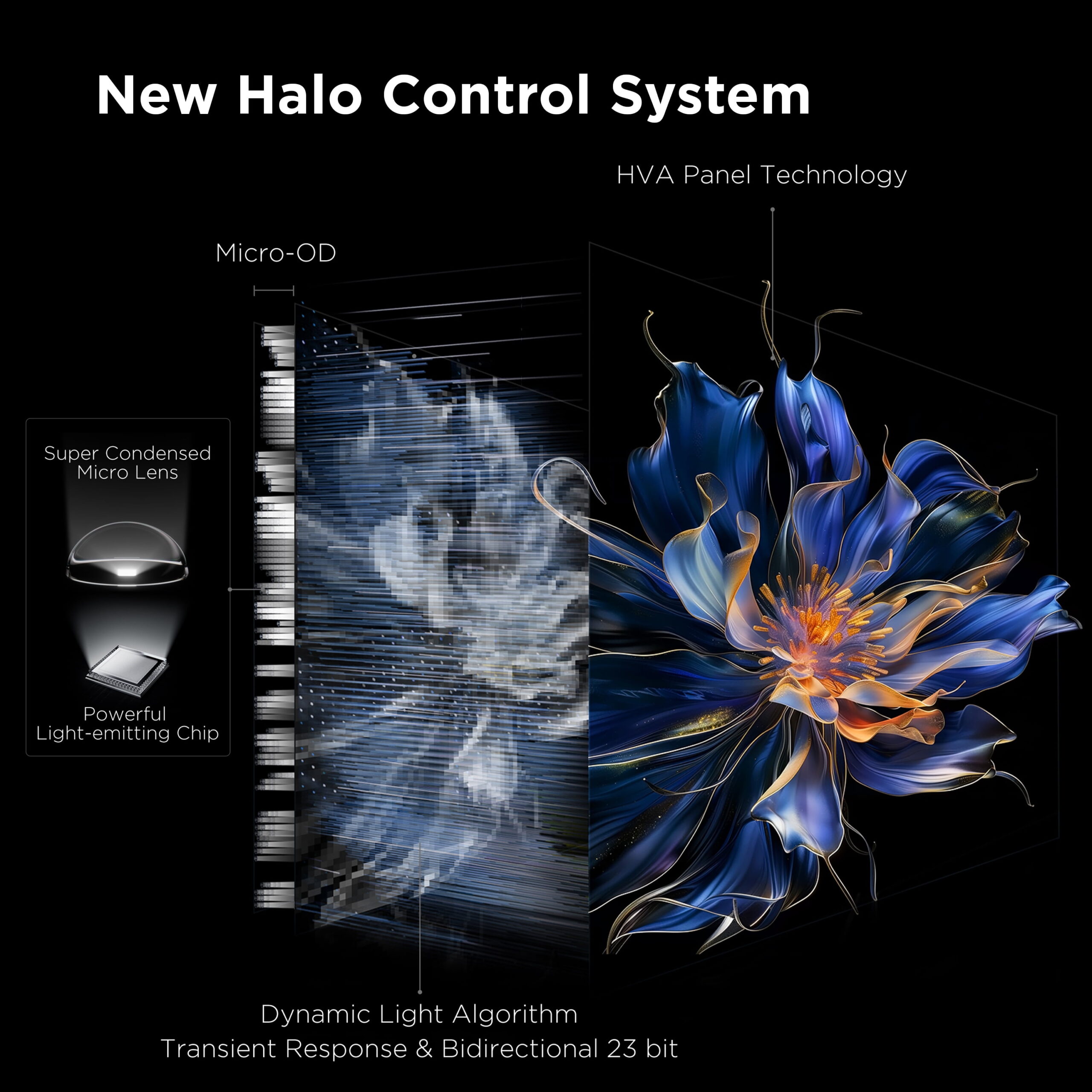 - TCL Halo Control System – An advanced Technology Suite that includes the New Super High Energy LED Microchip, Condensed Micro Lens, Micro-OD Reduced Optical Distance, CrystGlow HVA Panel, Enhanced QLED, Zero Delay Transient Response, Bi-direction 23-bit Backlight Controller, and Dynamic Light Algorithm for Stunning “Halo-Free” Images.